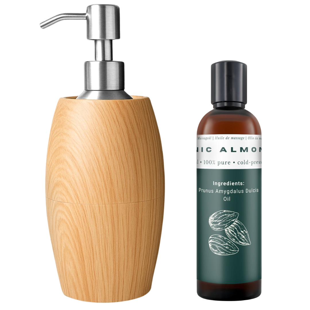 Massage Olieverwarmer Flaming Hout-Look donker inclusief 250ml biologische amandelolie